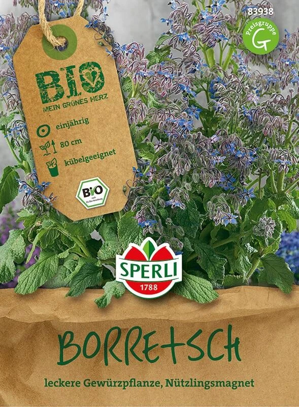 Bei dem BIO-Borretsch von SPERLI handelt es sich zwar in der erster Linie um ein einjähriges Würzkraut, das auch als Gurkenkraut bekannt ist und mit dem sich zum Beispiel Salate und Suppen wunderbar aromatisch verfeinern lassen. Es bildet aber auch zierliche blaue Blüten in Sternform aus, die ebenfalls essbar sind und sogar im Blumenbeet eine gute Figur machen! Der BIO-Borretsch erreicht an sonnigen oder halbschattigen Standorten eine Wuchshöhe von bis zu 80 cm. Ausgesät werden können die Samen ins Freiland oder in Kübeln in der Zeit von März bis Juli. Eine Ernte der Blätter und Blüten ist bei früher Aussaat von Mai bis Oktober möglich. Werden die Blüten nicht mit geerntet, sind sie übrigens ein echter Nützlingsmagnet.