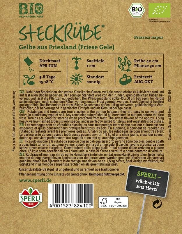 Kohl- oder Steckrüben sind echte Klassiker im Garten, weil sie auf nahezu jedem Boden gedeihen und anspruchslos zu kultivieren sind. Die BIO-Steckrübe ‚Gelbe aus Friesland‘ stellt dabei keine Ausnahme dar. Lediglich einen sonnigen Standort benötigt diese Sorte für ein robustes Wachstum und die Ausbildung ihrer ca. 1,5 kg schweren, gelb-orange-fleischigen Wurzelknollen. Die Aussaat kann von April bis Juni erfolgen. Ab August können die Rüben bis zum Frost geerntet und verarbeitet werden. Für gemischte Eintöpfe und als Gemüsebeilage eignen sie sich besonders gut.