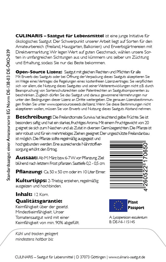 Die Freilandtomate Sunviva hat leuchtend gelbe Früchte. Sie ist besonders saftig und hat ein starkes, fruchtiges Aroma.Mit einem Fruchtgewicht von 20 g eignet sie sich zum Naschen, zum Dekorieren von Salaten und als Zutat in diversen Gemüsegerichten. Die Pflanze ist sehr robust und für ein mehrtriebiges Ziehen geeignet. Der ungeschützte Freilandanbau ist möglich. Die Pflanze sollte regelmäßig ausgegeizt und hochgebunden werden. Eine ausreichende Nährstoffversorgung erhöht den Ertrag. Das Saatgut von Sunviva untersteht der Open-Source-Lizenz und darf bei ihrer Nutzung und Weiterentwicklung nicht durch Sortenschutz- oder Patentrechte eingeschränkt werden.