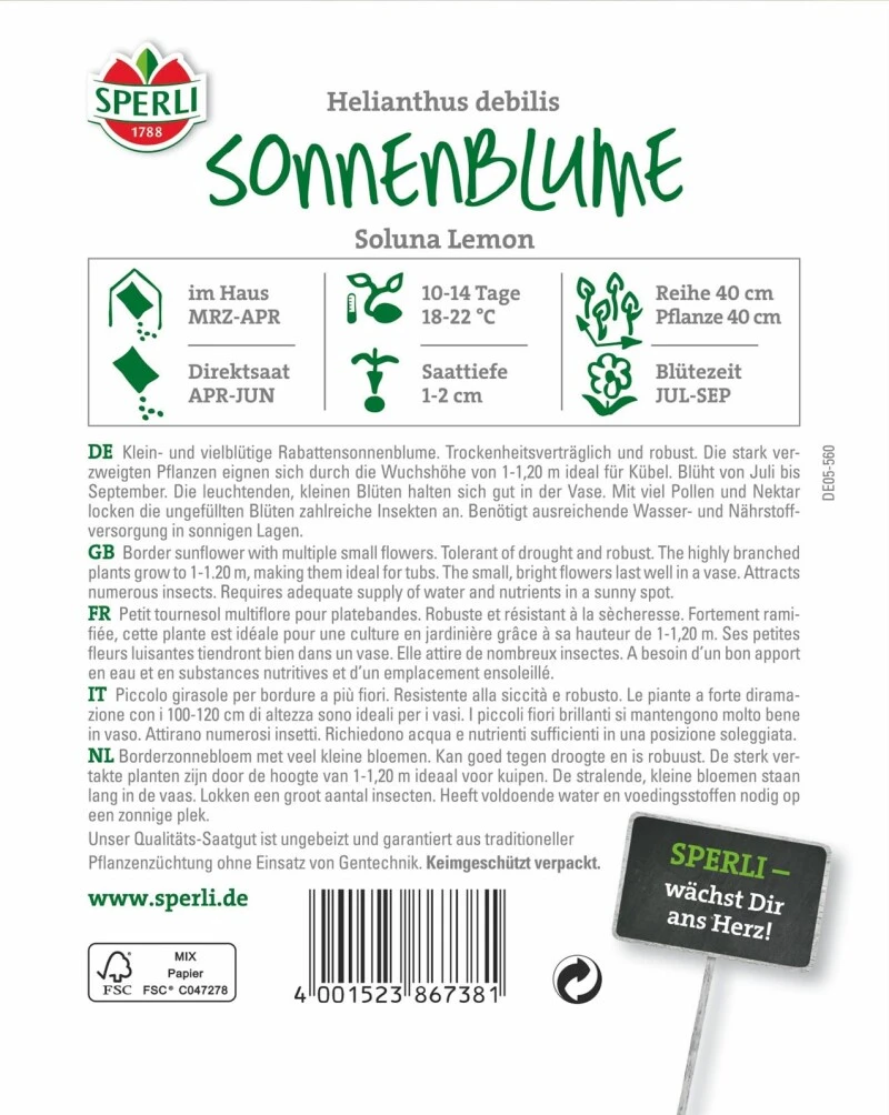 Klein- und vielblütige Rabattensonnenblume. Trockenheitsverträglich und robust. Die stark verzweigten Pflanzen eignen sich durch die Wuchshöhe von 1 – 1,20 m ideal für Kübel. Blüht von Juli bis September. Die leuchtenden, kleinen Blüten halten sich gut in der Vase. Mit viel Pollen und Nektar locken die ungefüllten Blüten zahlreiche Insekten an. Benötigt ausreichende Wasser- und Nährstoffversorgung in sonnigen Lagen.